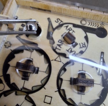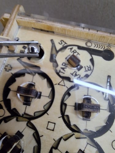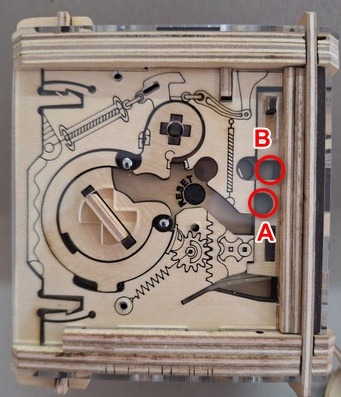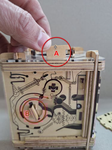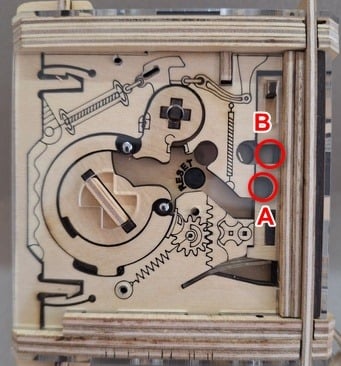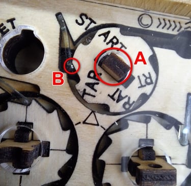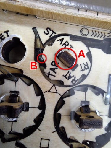 Giramos la pieza A en sentido antihorario hasta ver que la bolita B es "arrastrada" por el mecanismo (no girar la pieza hasta formar la palabra "START" ya que de hacerlo, la bolita quedaría liberada).