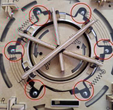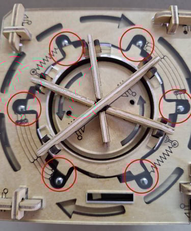Colocamos la tapa central, teniendo la precaución que la pieza redonda esté en la posición de "bolitas bloquedas". Giramos la tapa recién colocada en sentido horario hasta que no se pueda rotar mas. Las bolitas deben quedar liberadas.