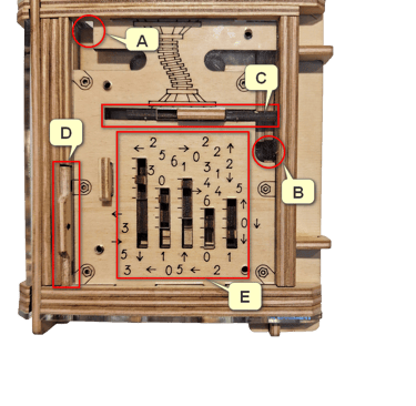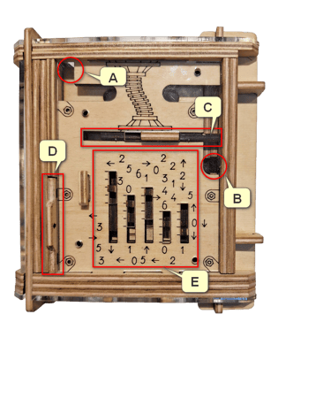 Solo tenés que llevar la bolita desde "A" hasta "B", para lo cual deberás lograr mover el deslizante "C" a la izquierda, movimiento que solo se puede realizar al descubrir la posición correcta que deben tener las cinco palancas "E", por medio del uso de la "tablilla descifradora D" (que estoy casi seguro no habias visto)