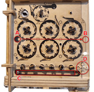4_ para que la esfera metálica ubicada en "C" pase de un lado a otro, las "palanquitas" deben estar orientadas de una forma específica. Esa orientación hace que la carita mire hacia uno de los 4 "puntos cardinales" visibles en "D" (circulo, triángulo, cuadrado, mas). Esto es una analogía de como resolver esta cara del cubo.
